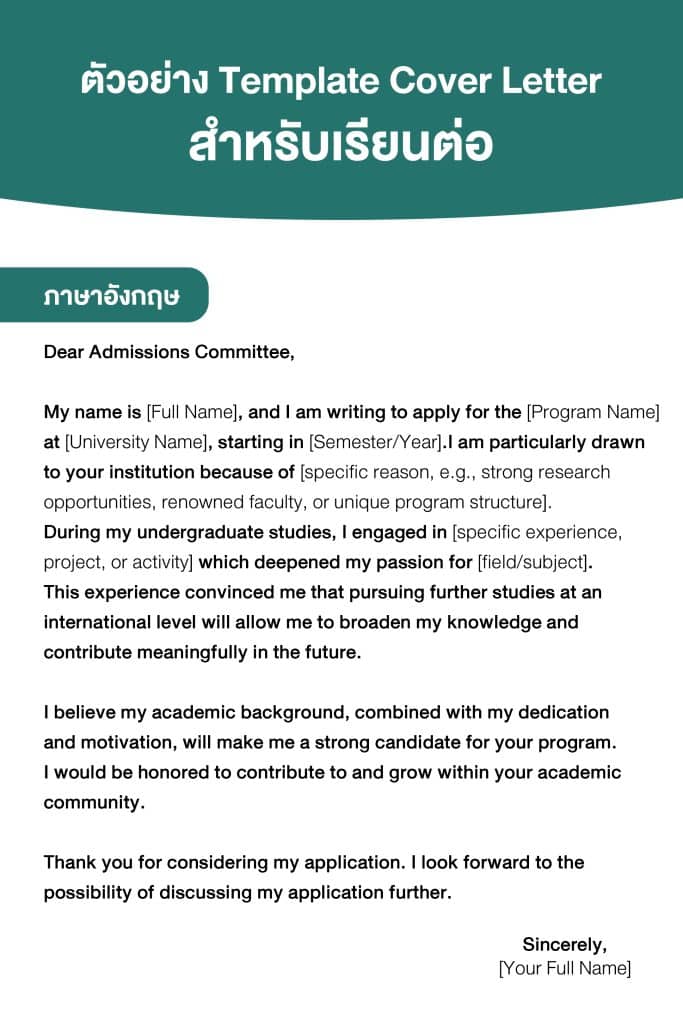อีกหนึ่งหัวใจสำคัญคือการเชื่อมโยงเนื้อหากับสถาบันโดยตรง การเอ่ยชื่อรายวิชา ศูนย์วิจัย หรืออาจารย์ที่อยากเรียนด้วย จะทำให้ Cover Letter ของคุณแตกต่างและสะท้อนว่ามีการศึกษาข้อมูลสถาบันจริง ไม่ได้เขียนจดหมายแบบทั่วไปที่ใช้ซ้ำได้กับทุกมหาวิทยาลัย