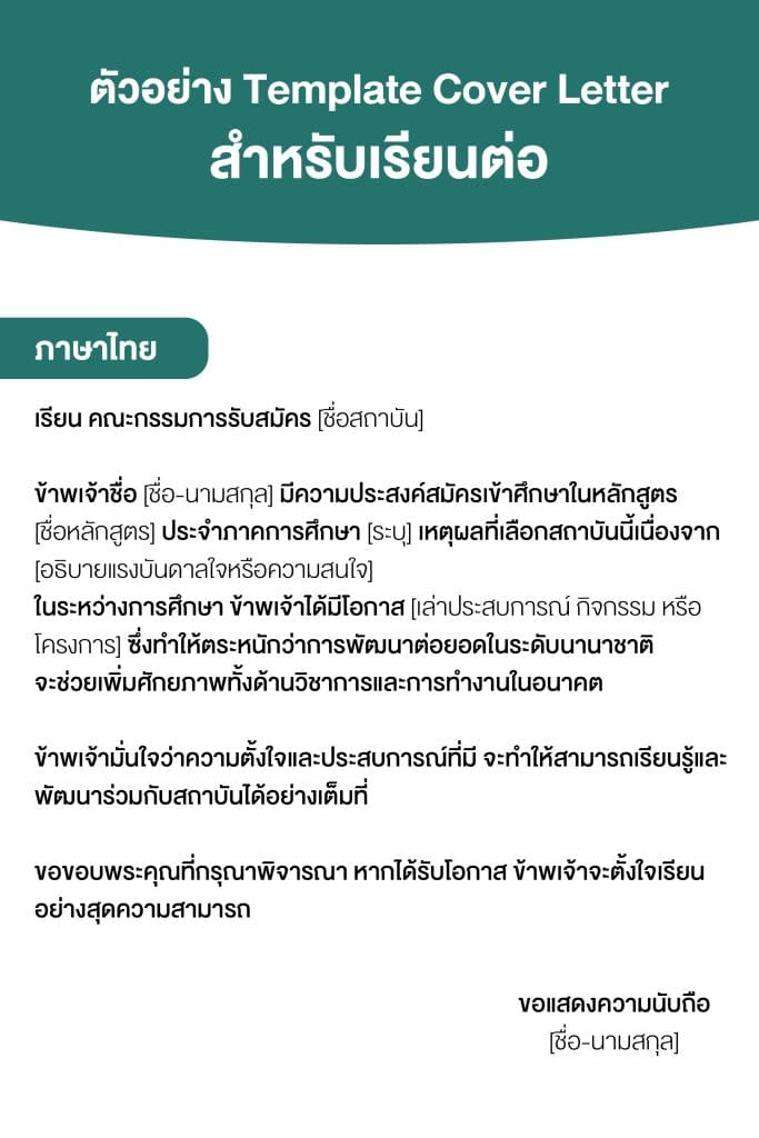 - สำหรับคนที่ต้องการ ทุนการศึกษา Cover Letter ยังเป็นตัวช่วยแสดงว่าคุณไม่ได้มาเพียงเพื่อหาความรู้ แต่พร้อมที่จะสร้างคุณค่าและมีเป้าหมายกลับไปพัฒนาสังคม